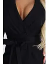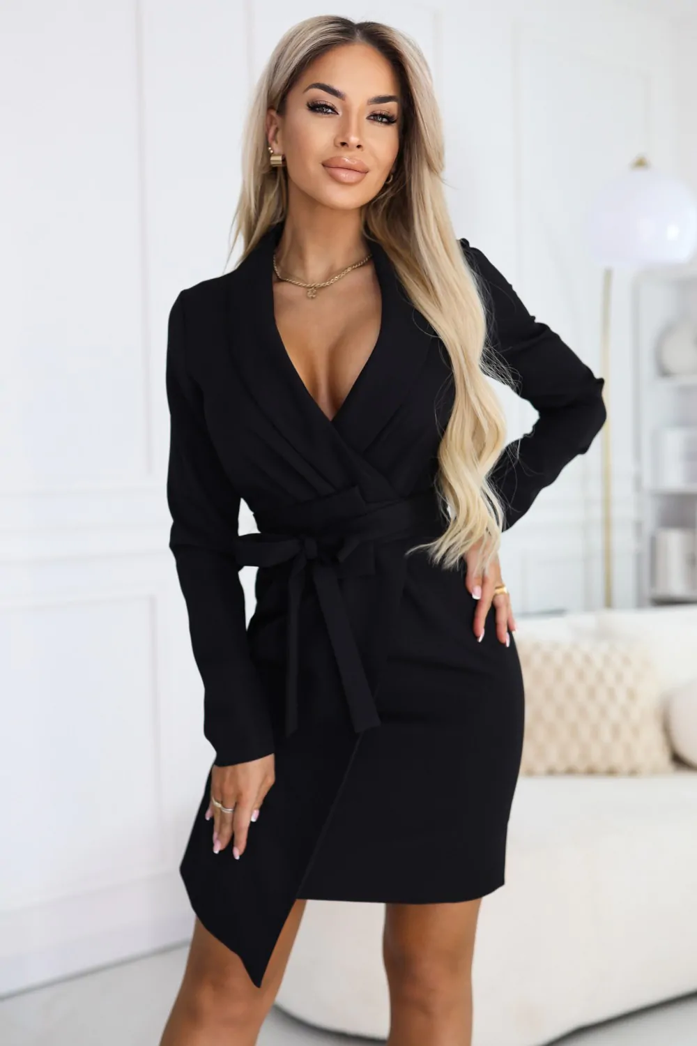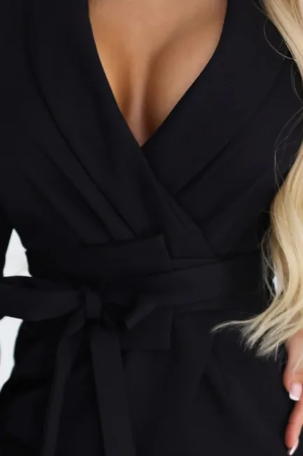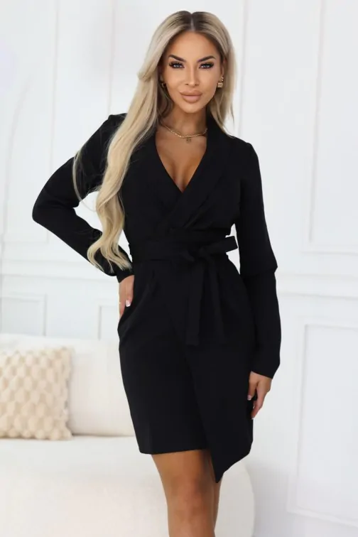 Elegancka sukienka marynarkowa z paskiem i asymetrycznym dołem to stylowa propozycja dla kobiet, które cenią nowoczesną elegancję i wyrazisty krój. Fason inspirowany klasyczną marynarką nadaje stylizacji szyku, a podkreślona talia z paskiem pięknie modeluje sylwetkę. Asymetryczny dół przyciąga uwagę i dodaje całości lekkości oraz dynamicznego charakteru, dzięki czemu sukienka prezentuje się niezwykle efektownie w ruchu. Model wykonany jest z przyjemnego, elastycznego materiału, który dobrze dopasowuje się do sylwetki i zapewnia komfort noszenia. To doskonały wybór na eleganckie spotkania, uroczystości lub wieczorne wyjścia, kiedy chcesz wyglądać stylowo i kobieco.