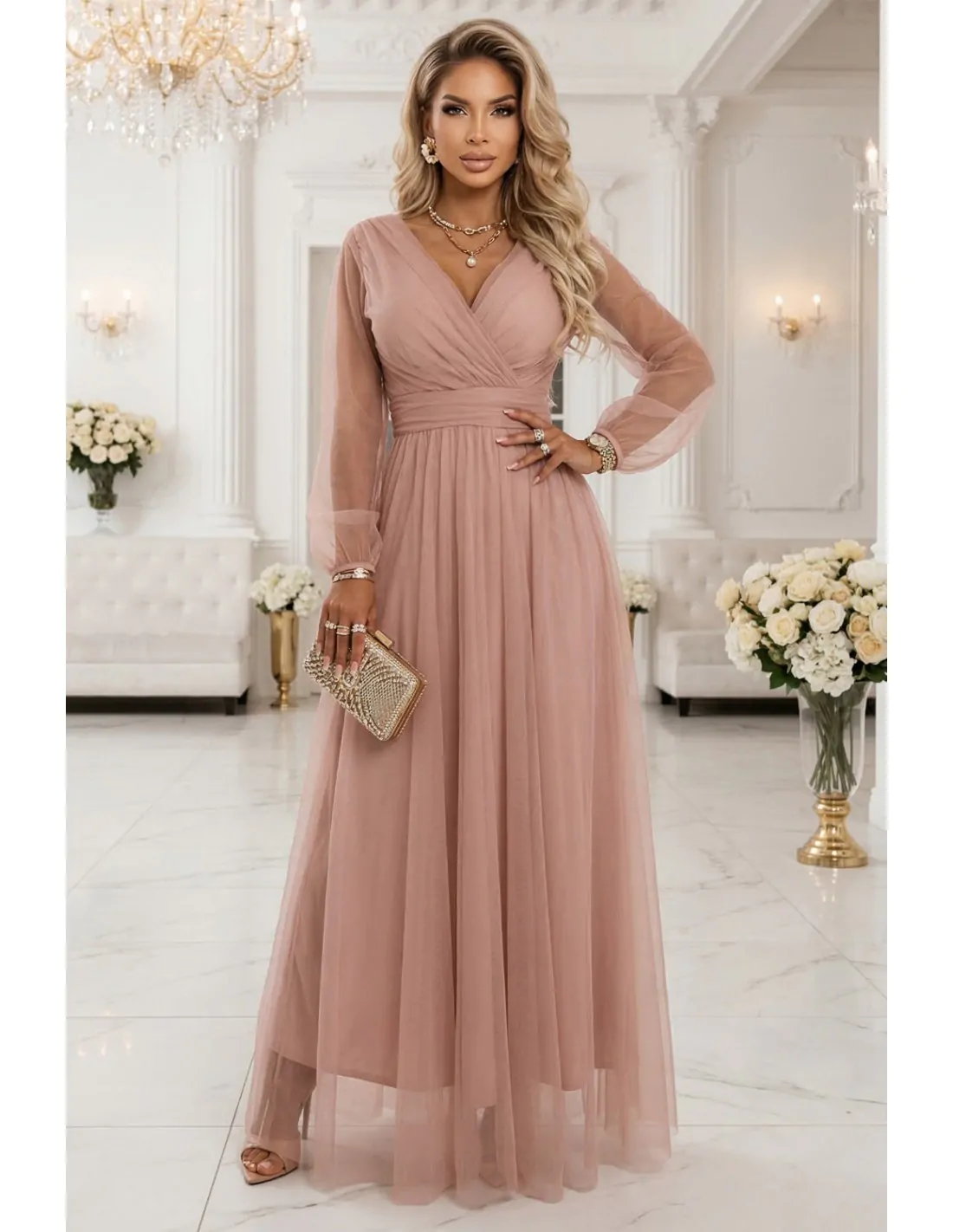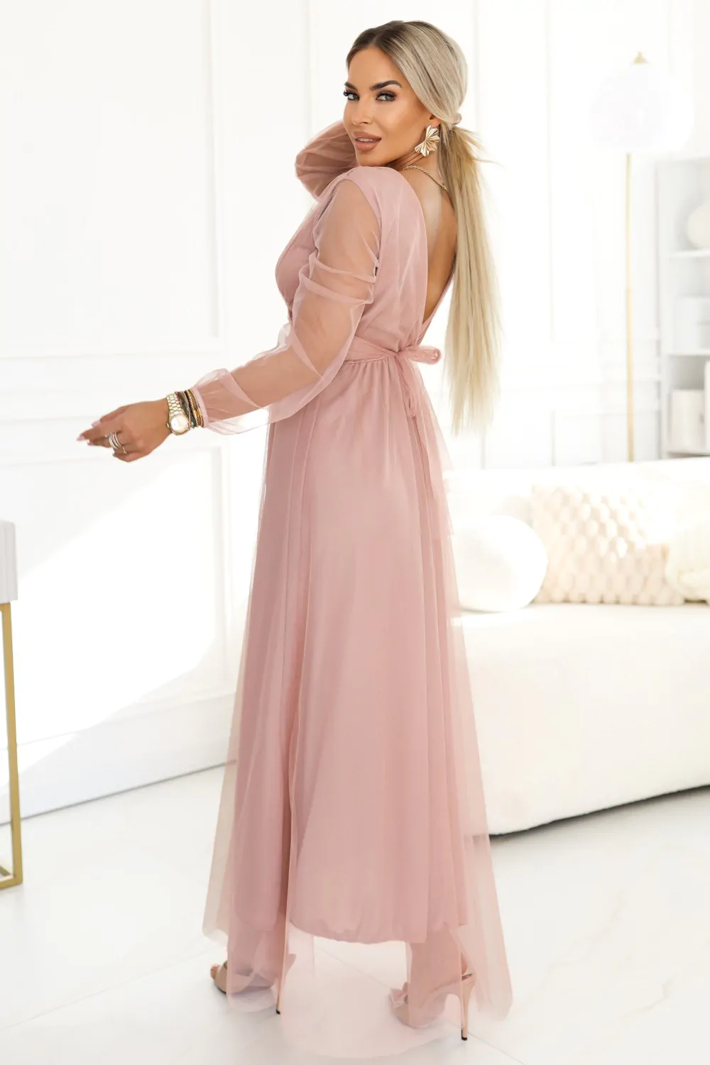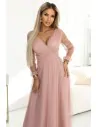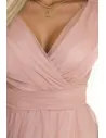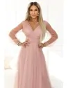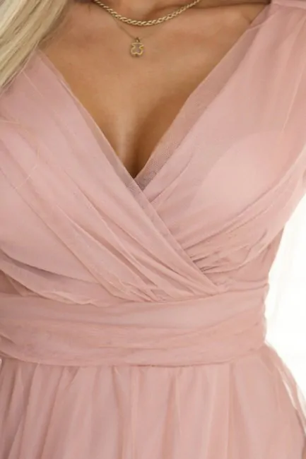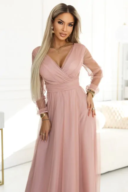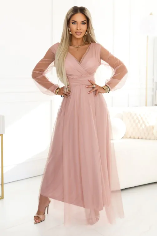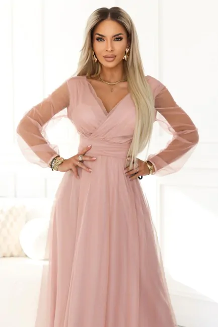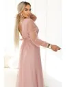 DM1587 Sukienka maxi z tiulowymi rękawami - pudrowa