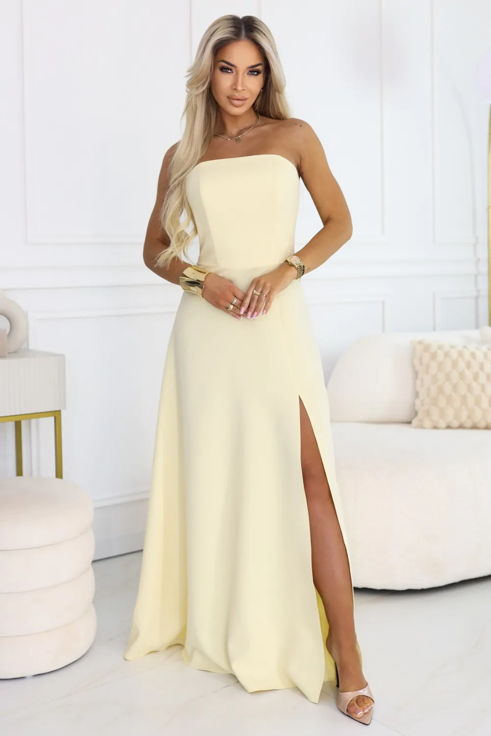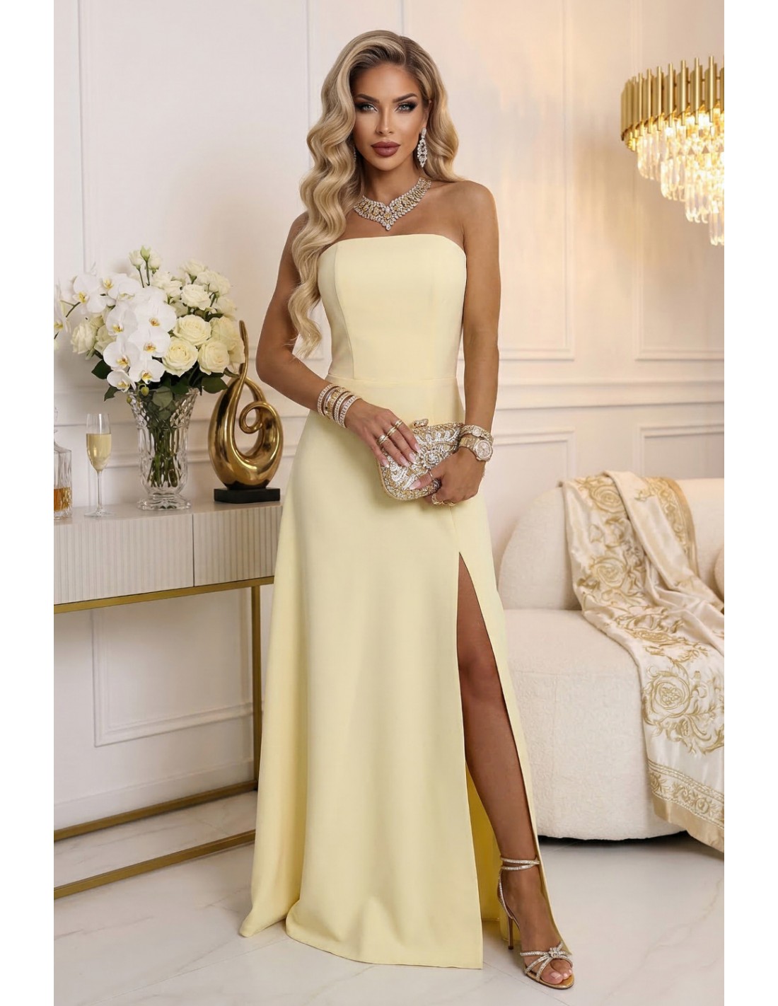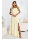 DM1596 Gorsetowa sukienka maxi z rozcięciem na nogę - żółta