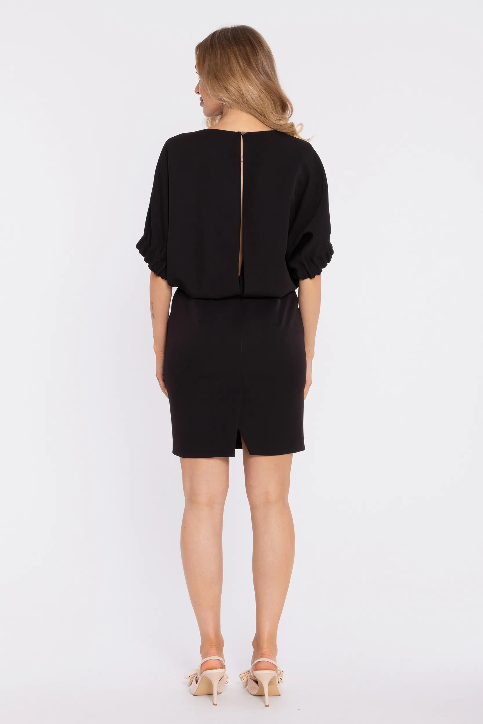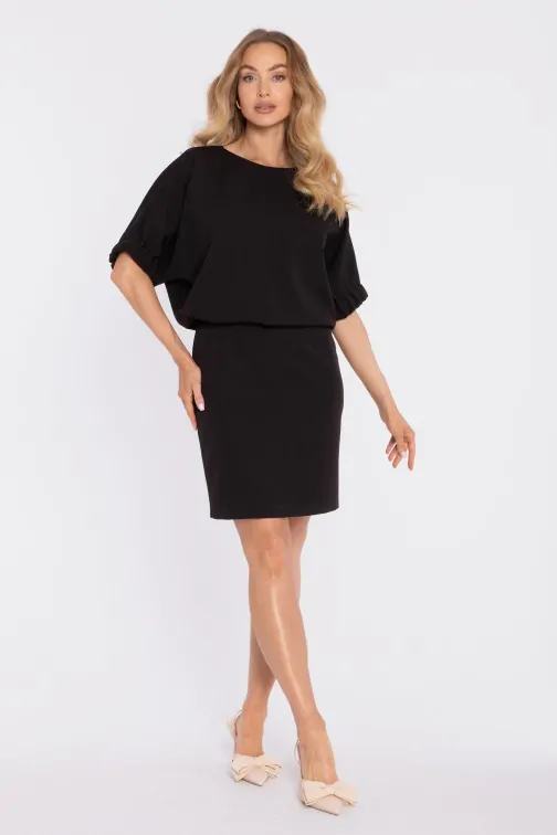Fason: elegancka, minimalistyczna mini z luźną górą i bufiastymi rękawami