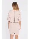 Elegancka minimalistyczna sukienka mini to nowoczesna propozycja dla kobiet, które cenią prostotę formy i subtelne, dopracowane detale. Wykonana z gładkiej tkaniny o matowym wykończeniu, prezentuje się niezwykle szykownie i ponadczasowo. Bluzowana, lekko oversize’owa góra nadaje sylwetce lekkości, a krótkie bufiaste rękawy zakończone gumką wprowadzają delikatny, kobiecy akcent. Prosty, lekko dopasowany dół z niewielkim rozcięciem z tyłu podkreśla nogi i zapewnia swobodę ruchów. Zabudowany dekolt z przodu kontrastuje z subtelnym, pionowym pęknięciem z tyłu zapinanym na guzik, dodając całości eleganckiego charakteru. To idealna mini na wyjątkowe okazje, gdy liczy się klasa, minimalizm i wyrafinowany styl.
