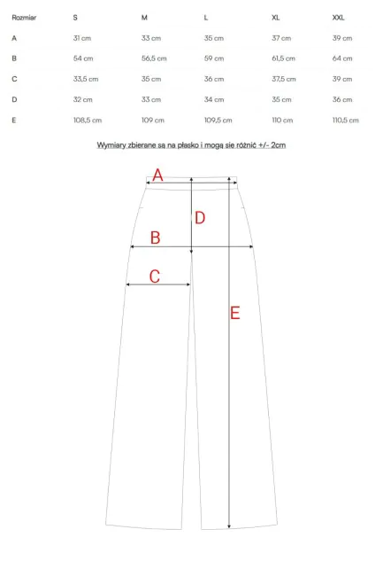 • Nogawki: bardzo szerokie, typu palazzo, długie