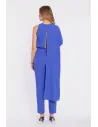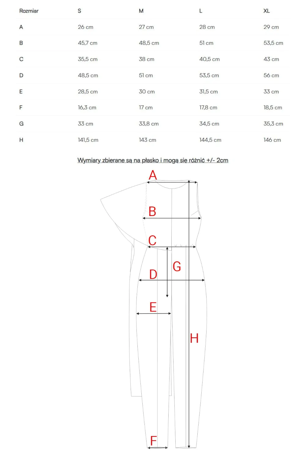 Elegancki kombinezon z asymetryczną pelerynką to nowoczesna i wyrafinowana alternatywa dla klasycznej sukienki. Wykonany z gładkiej tkaniny z lekkim połyskiem, subtelnie odbija światło, podkreślając wyjątkowy charakter stylizacji. Okrągły, delikatnie zabudowany dekolt pięknie eksponuje linię szyi, a efektowna, asymetryczna pelerynka opadająca na jedno ramię nadaje całości lekkości i spektakularnego efektu w ruchu. Z jednej strony fason pozostaje bezrękawnikowy, z drugiej pelerynkowa narzutka tworzy luźny, krótki rękaw, który z tyłu wydłuża się w elegancką, płynną formę. Podkreślona talia modeluje sylwetkę, a proste, lekko zwężane nogawki o długości 7/8 optycznie wydłużają nogi. To model dla kobiet, które chcą wyglądać z klasą, ale z wyrazistym modowym akcentem.