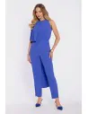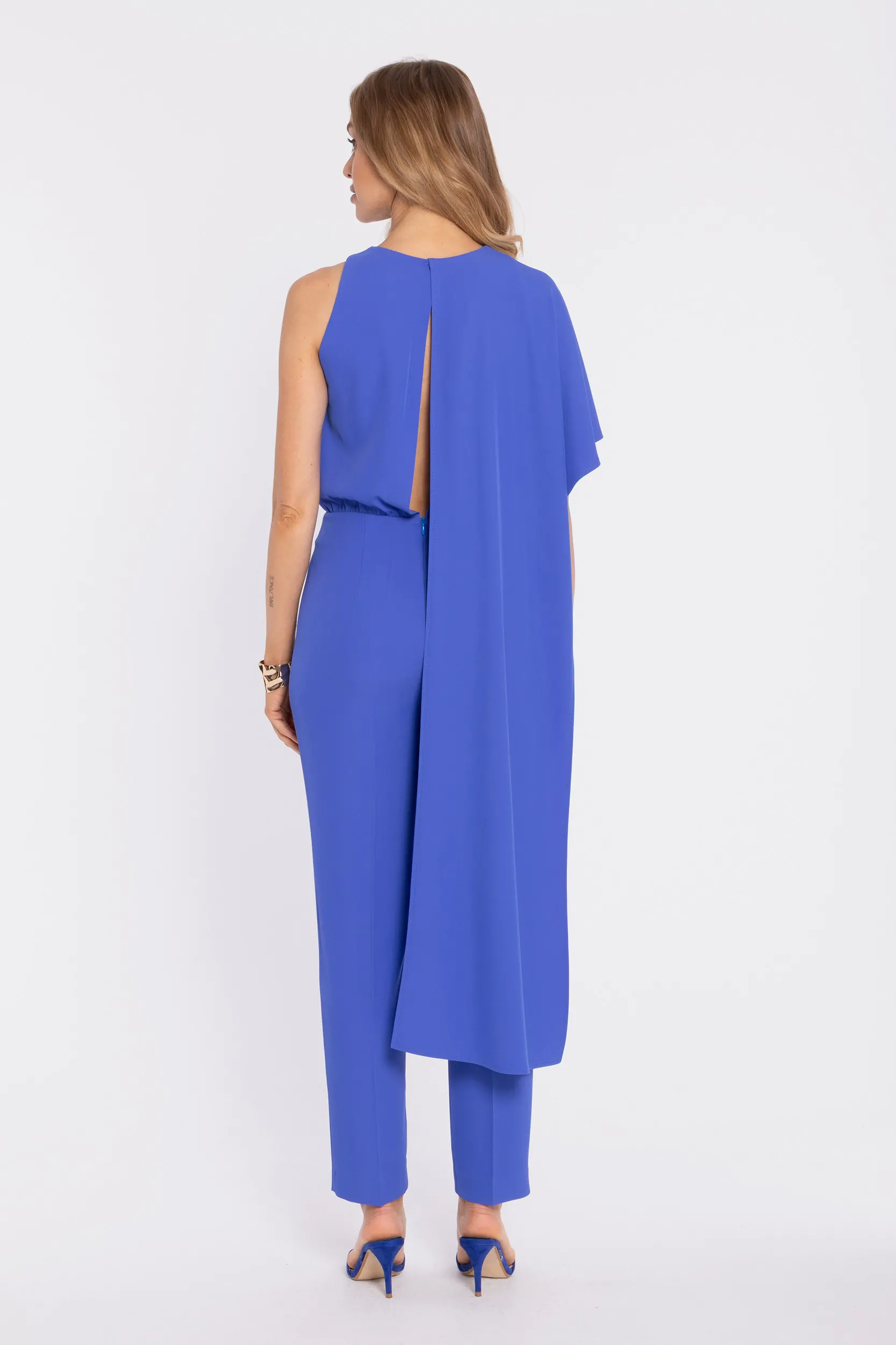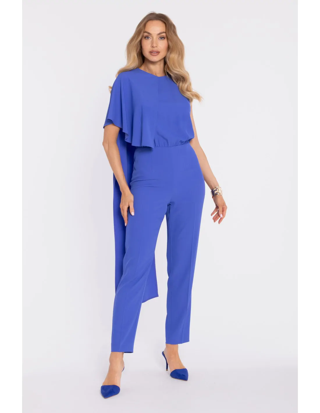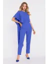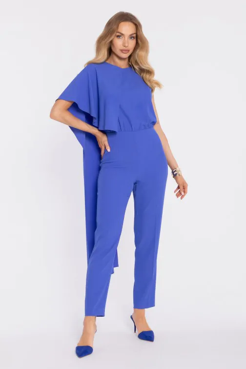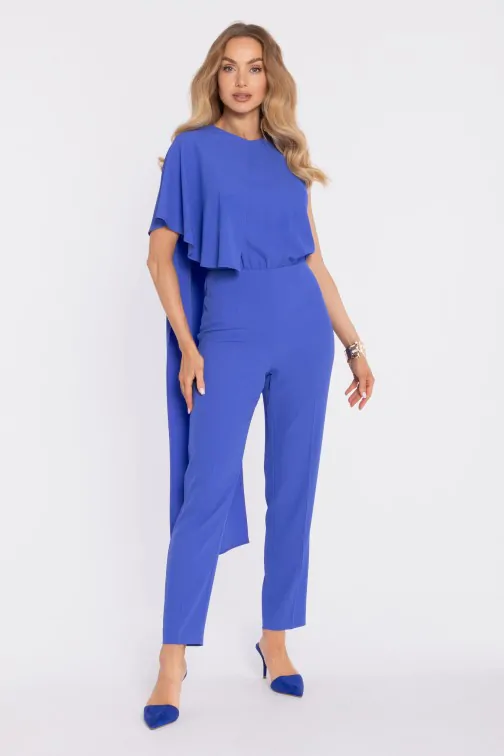 Fason: elegancki kombinezon z pelerynkową górą i smukłą nogawką