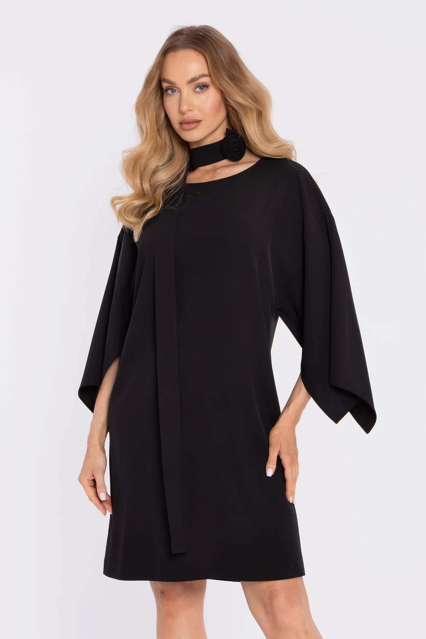 Sukienka z luźnymi rękawami i ozdobnym paskiem - czarna