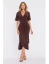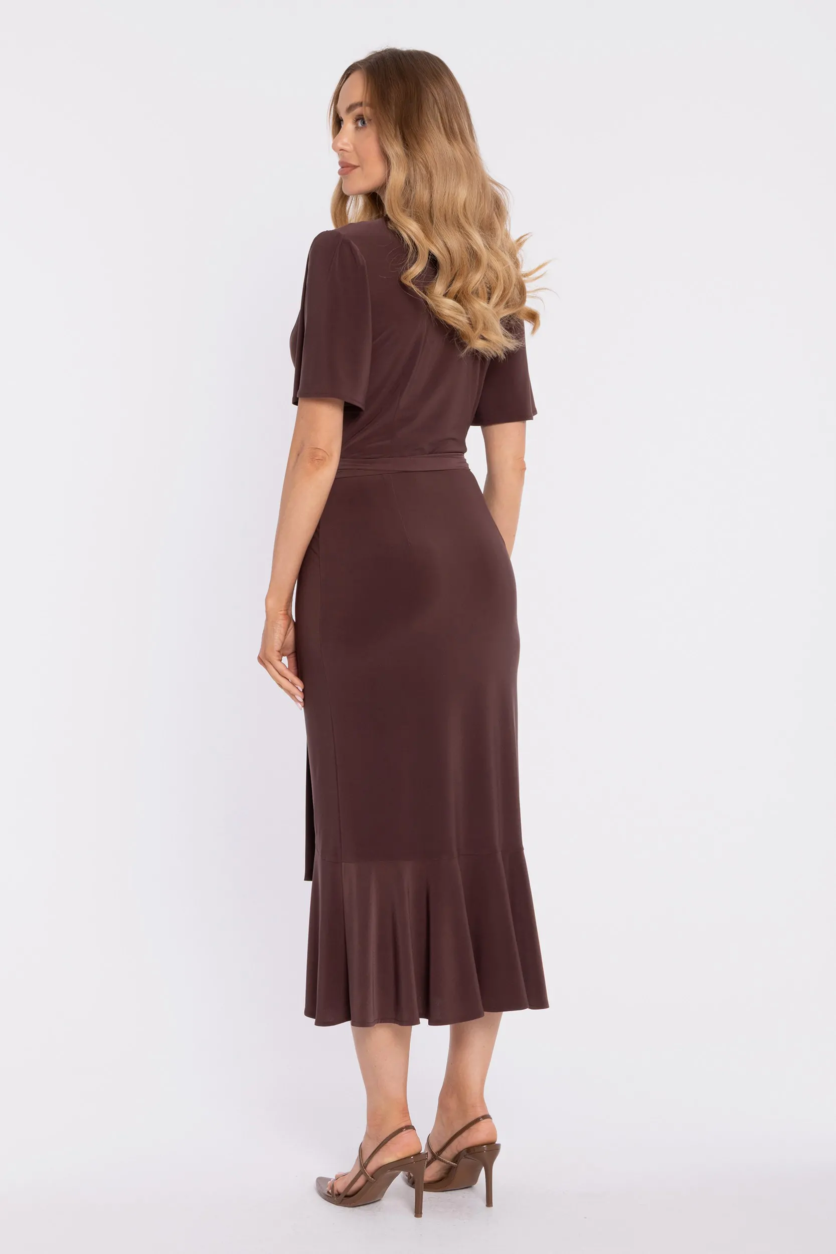 DM1674 Kopertowa sukienka midi z falbaną i marszczeniem - brązowa