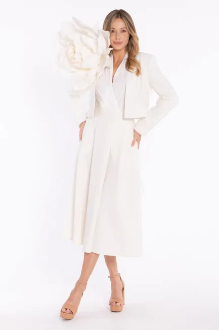 Stylowa alternatywa dla klasycznej marynarki z klapami. Dzięki skróconej formie doskonale komponuje się z sukienkami, spódnicami z wysokim stanem oraz eleganckimi spodniami. Sprawdzi się podczas uroczystości rodzinnych, komunii, chrzcin, spotkań, w pracy, a także jako eleganckie dopełnienie stylizacji weselnych.