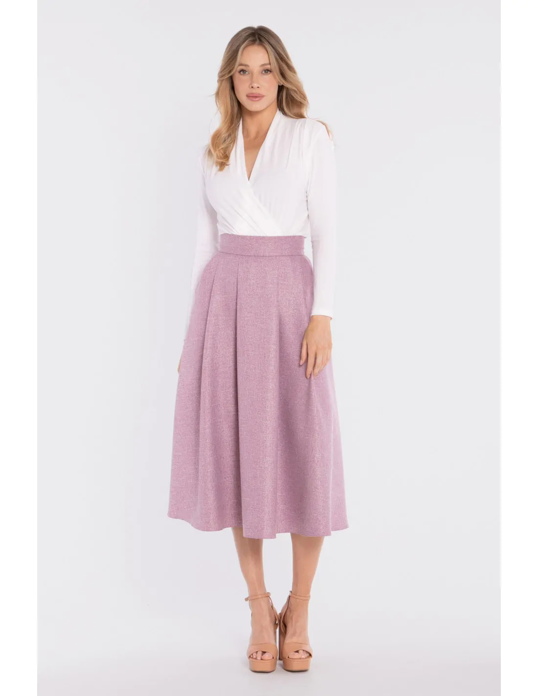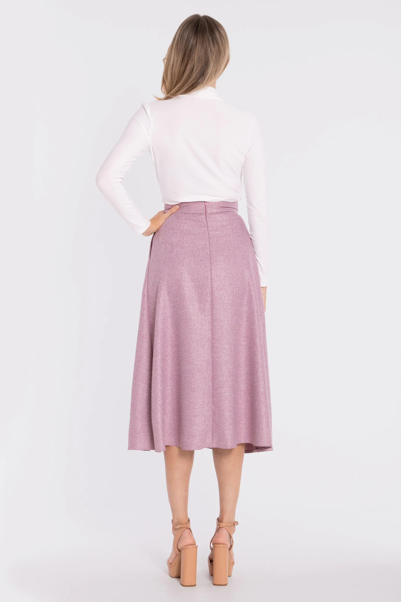 Fason: elegancka spódnica midi o rozkloszowanej linii