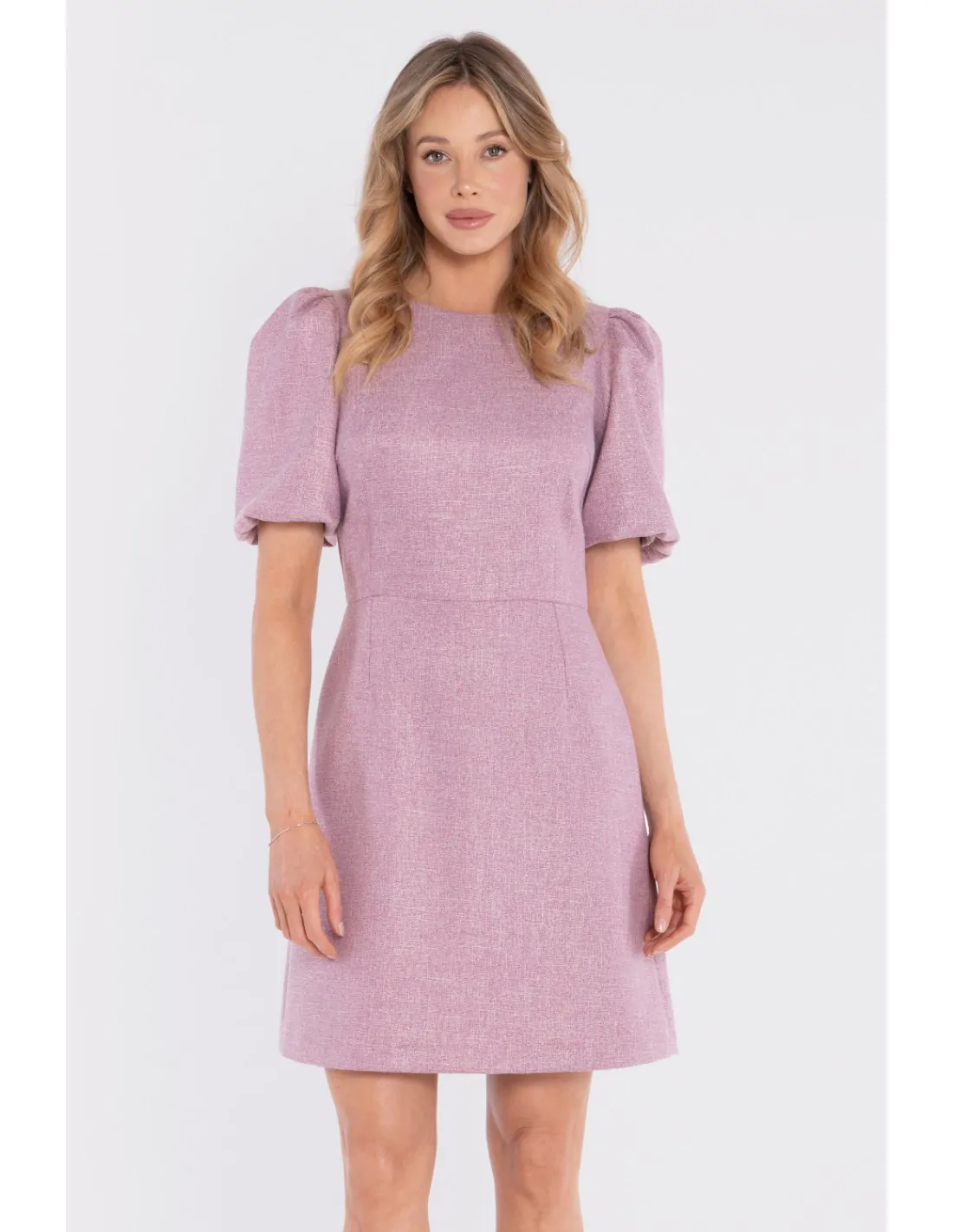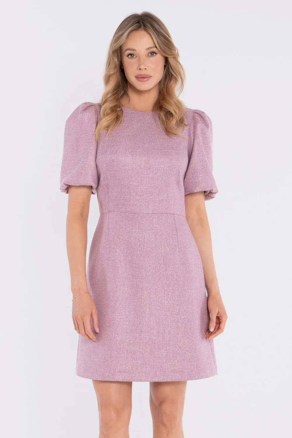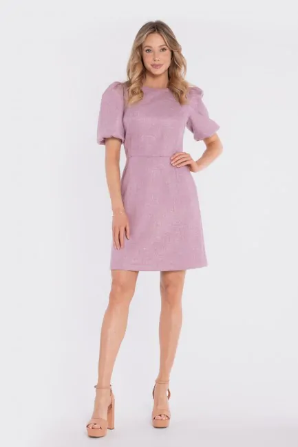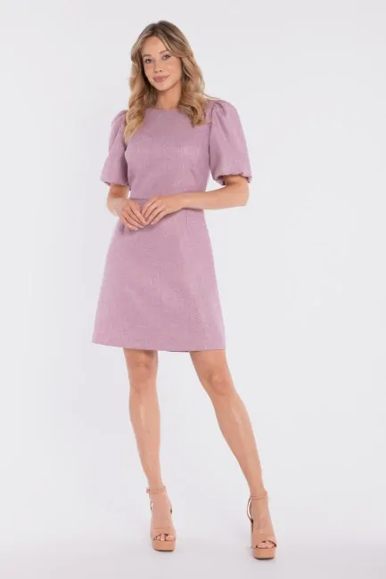 Elegancka sukienka tweedowa mini to klasyczna propozycja w nowoczesnym wydaniu, która łączy ponadczasowy styl z subtelną kobiecością. Wykonana z tkaniny tweedowej, wyróżnia się elegancką strukturą i szlachetnym charakterem. Okrągły, zabudowany dekolt podkreśla minimalistyczny styl, a krótkie, bufiaste rękawy dodają lekkości i modowego akcentu. Wyraźnie zaznaczona talia modeluje sylwetkę i eksponuje jej proporcje, natomiast dół lekko rozszerzający się ku dołowi zapewnia swobodę ruchów i harmonijną linię. To sukienka, która sprawdzi się zarówno w codziennych, bardziej dopracowanych stylizacjach, jak i podczas wyjątkowych okazji.