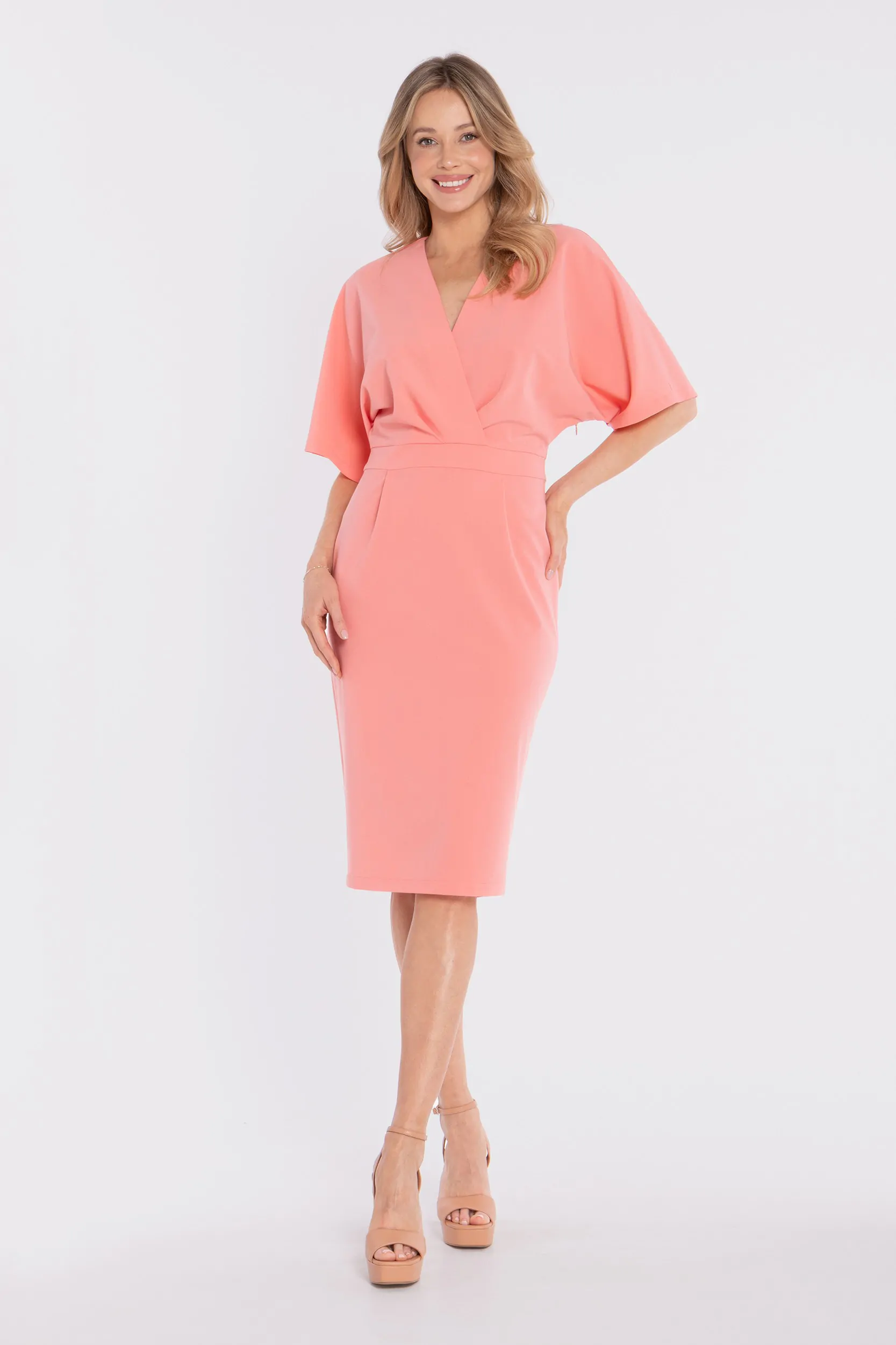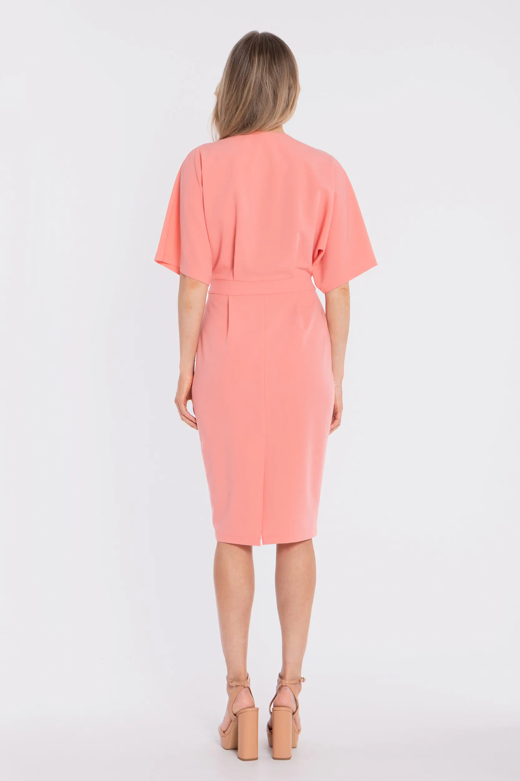Sukienka kopertowa midi z krótkimi rękawami - łososiowa
