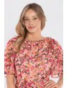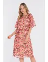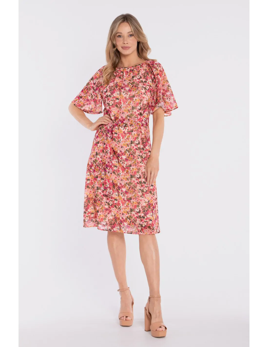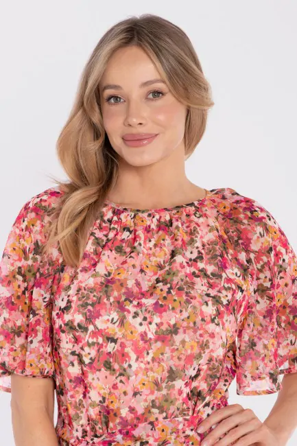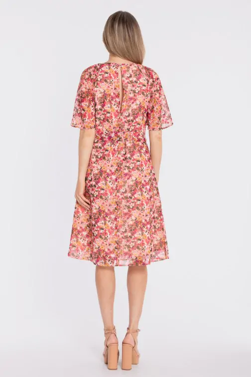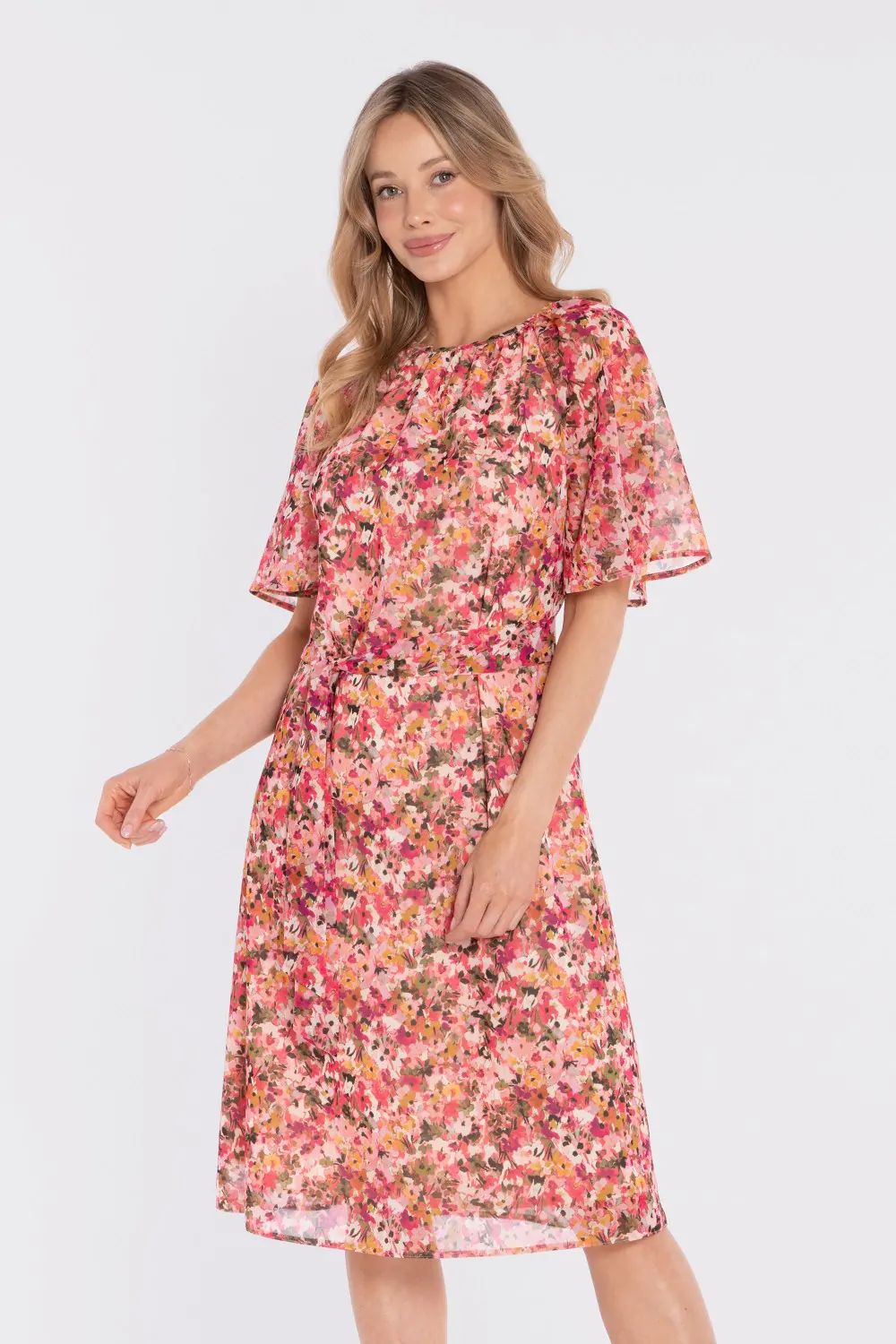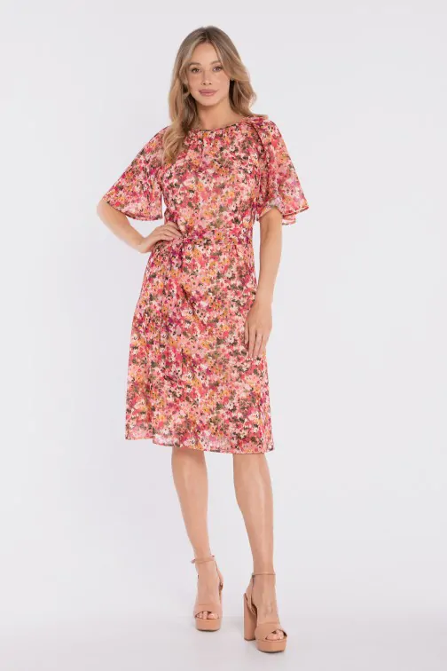 Zwiewna sukienka midi z printem i wiązaniem w talii to idealna propozycja dla kobiet, które cenią lekkość, wygodę i kobiecy styl. Wykonana z lekkiej tkaniny z subtelnym printem, pięknie układa się w ruchu i nadaje stylizacji świeżości. Okrągły, delikatnie zabudowany dekolt z marszczeniem przy szyi dodaje całości subtelnej elegancji. Krótkie, szerokie rękawy o lekko rozkloszowanej formie podkreślają zwiewny charakter sukienki i zapewniają komfort noszenia. Talia zaznaczona paskiem z tego samego materiału pozwala dopasować fason do sylwetki, a rozkloszowany dół o długości midi tworzy harmonijną, lekką linię.