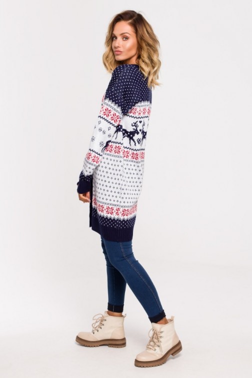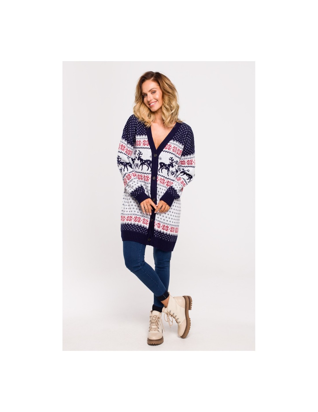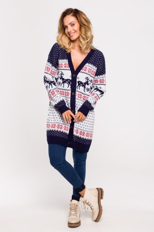 Nie wiesz, jak z dobrą energią wejść w świąteczny okres? Podpowiadamy - otaczaj się rzeczami, które wprawią Cię w świetny nastrój i będą przypominać o tym wyjątkowym czasie. Długi sweter zapinany na rząd guzików jest jedną z takich propozycji, którą wkładasz na siebie, a dobre emocje lgną do Ciebie jak nigdy dotąd. Zimowe motywy sprawiają, że to model na cały okres zimowy i niekoniecznie musisz nosić go tylko przez kilka dni w roku. Ma głęboki dekolt, dlatego pod spód możesz założyć sukienkę, bluzkę lub koszulę i stworzyć ciekawe połączenie, w którym z łatwością przeżyjesz mroźne dni. Chcesz mieć go tylko dla siebie? Wyprodukowano w Polsce.