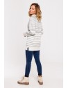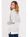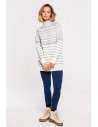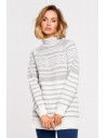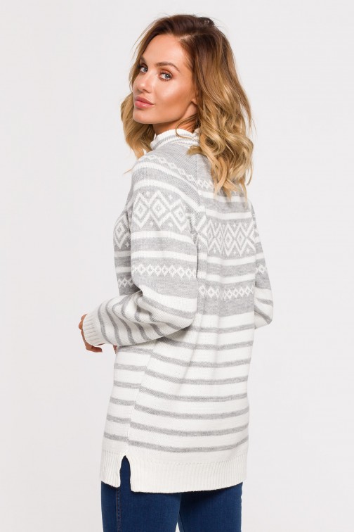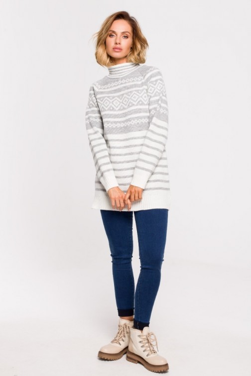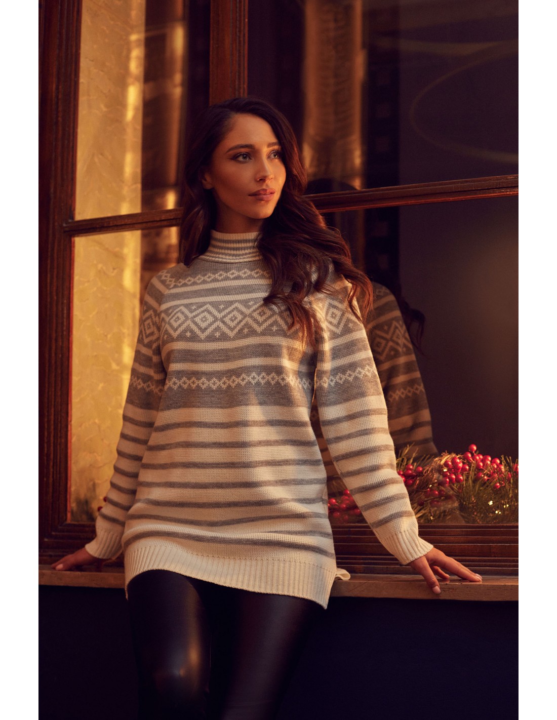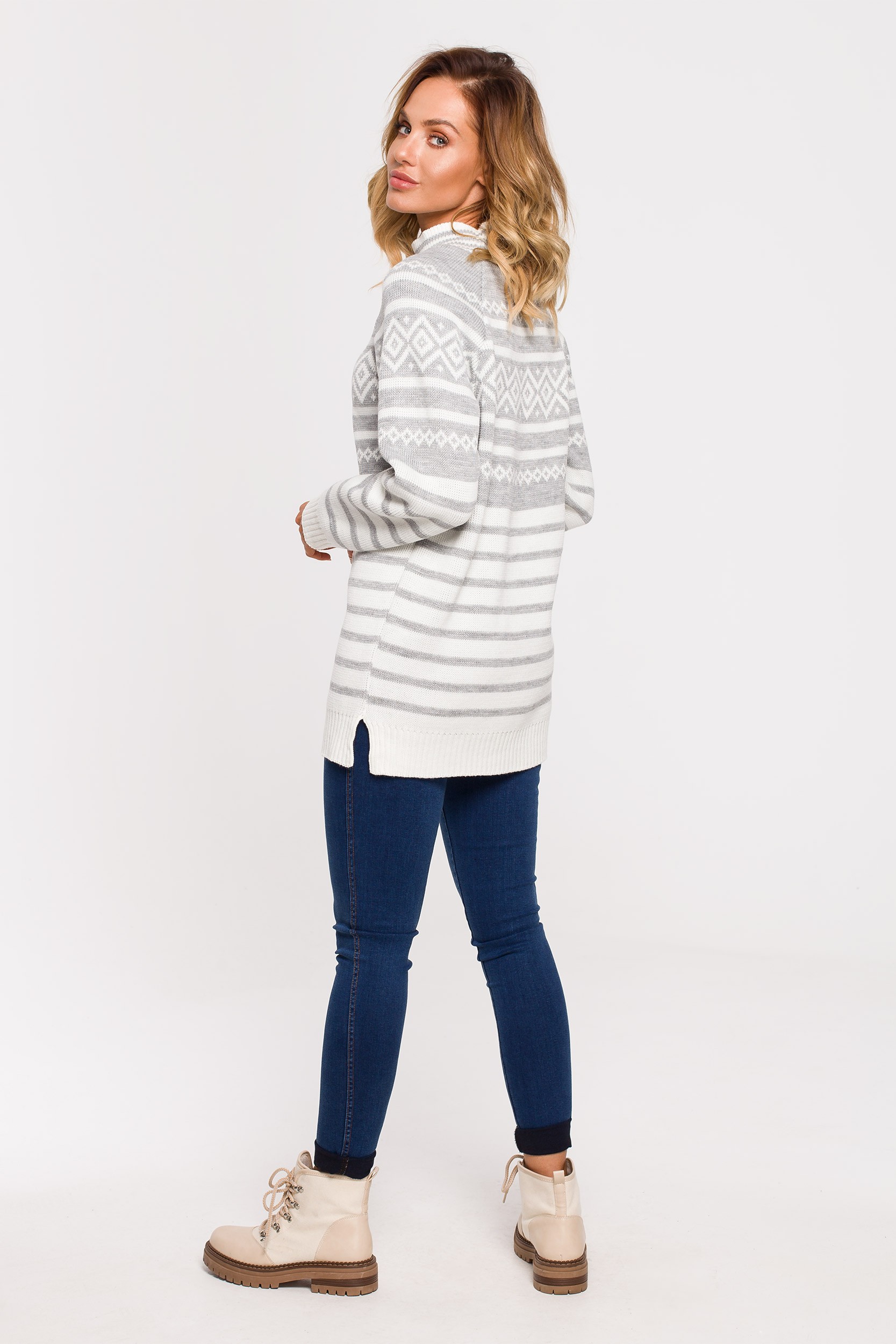 Hu hu ha, nasza zima zła, nie straszna kiedy masz ciepły sweter z półgolfem w delikatne prążki z zimowym motywem pod szyją. Przedłużony krój z rozcięciami na bokach zapewni komfort nawet w najchłodniejsze dni. Wyprodukowano w Polsce.